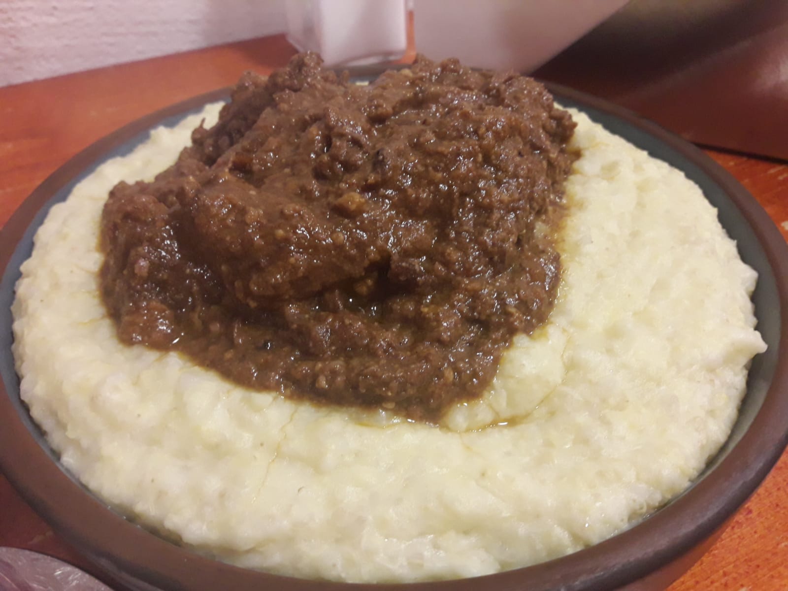 גומי עם חרצ'ו: גומי הוא ה"פולנטה" שלהם. הם יתארו לכם את זה ככה ומייד יוסיפו "אבל זה לא פולנטה" וזה באמת לא מזכיר פולנטה בשום אופן, למרות שמדובר בסוג של דייסת תירס. במקרה זה היא הוגשה עם תבשיל של בשר ואגוזי מלך (הגיאורגים מאד אוהבים אגוזי מלך והם מופיעים בערך בכל מנה)