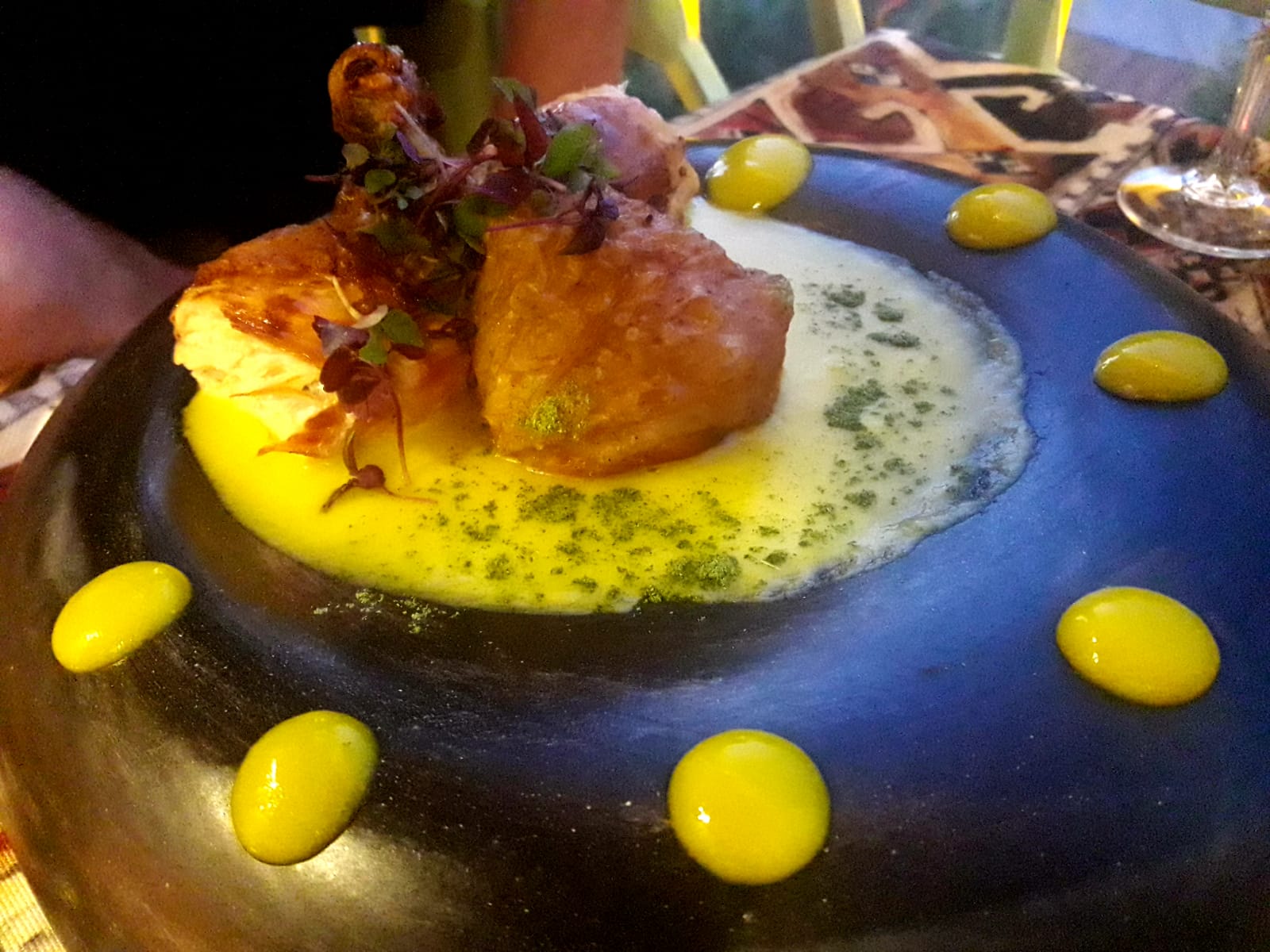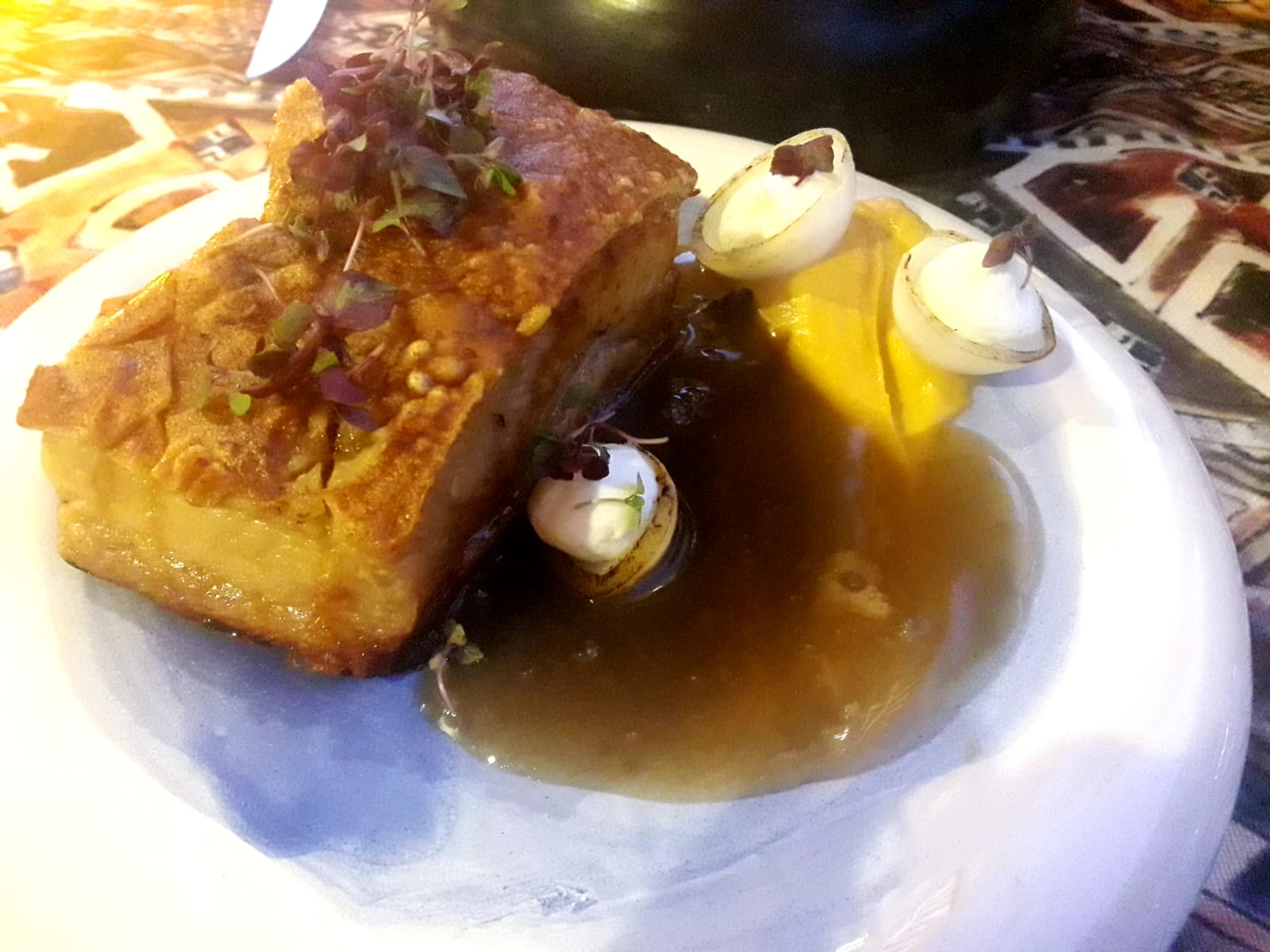 העיקרית השניה הייתה חזיר ברוטב יין לבן. מסוג המנות שחוזרים בשבילן למסעדות. קיבלתי נתח חזיר עצום עם עור כל כך פריך, שכל המסעדה שומעת כשאתם לועסים. הוא הוגש עם קרם דלעת ובצלצלים ממולאים בגבינה. (תמונה 4).