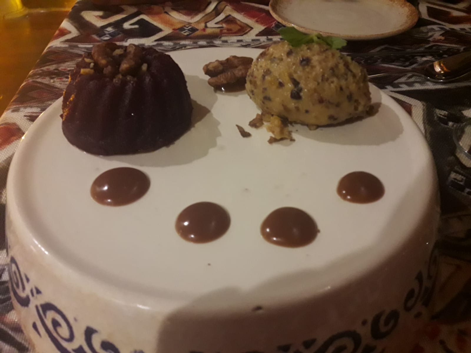 בשלב זה הרגשנו שנכנענו. בקושי סיימנו את העיקריות כשאחריהן המלצר, בלי לשאול, ערך לנו לקינוח ואמר שקיבלנו מתנה מהם (אולי בגלל ההמתנה הארוכה בראשונות). אני חושבת שהקינוח היה מן וריאציה על הצו'רצ'חלה (ה"נקניק" של פירות ואגוזים שיש הכל פינה). זה היה עוגת ענבים לצד גלידת פירות יבשים, עם שברי אגוזים ורוטב קרמל.