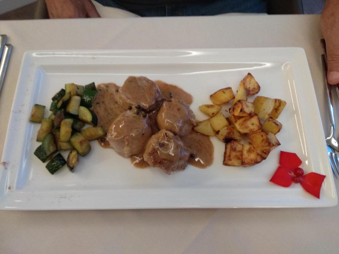 למנה עיקרית הוא בחר במנה של בשר חזיר ברוטב עשיר על בסיס שמנת. לצידם