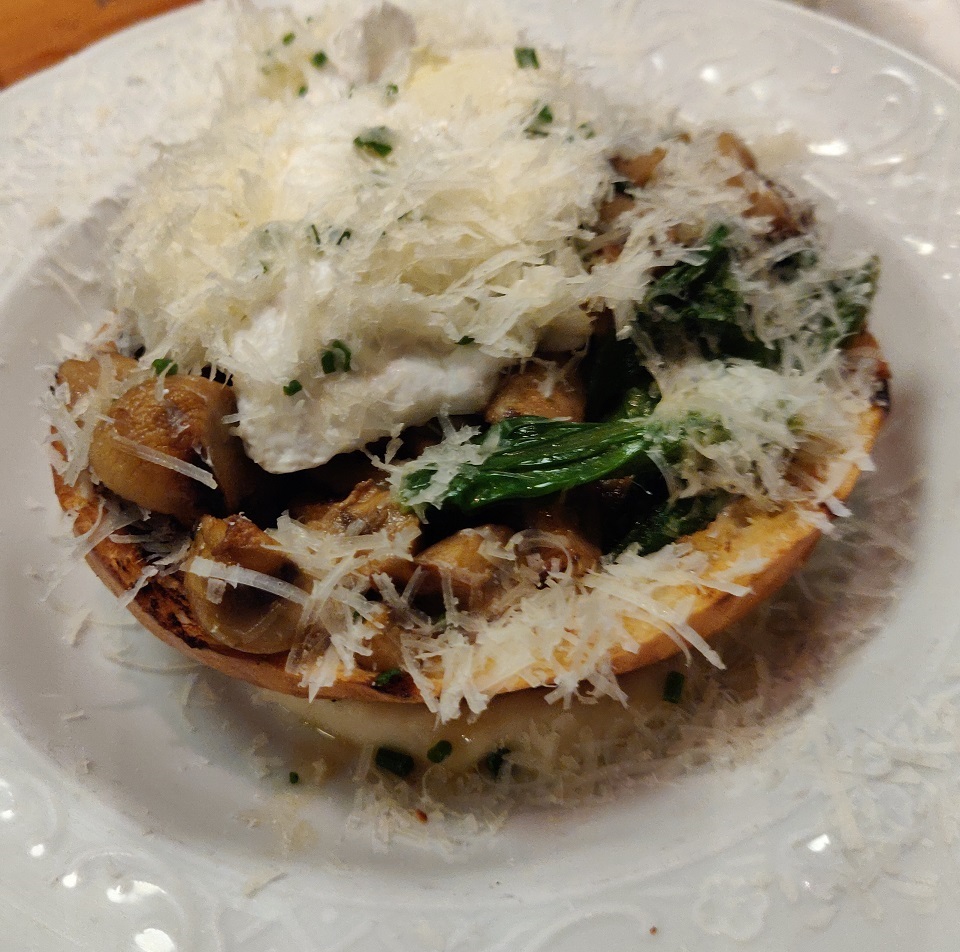 כשהמנה הגיעה ריחף מעליה ענן ריח של פרמז'ן שפתח ציפיות למנה מנחמת טובה, אבל דווקא המנה הזו לא נרשמה כהצלחה. בריוש אנחנו מאד אוהבים, ועם ראגו פטריות וביצה עלומה מה כבר יכול להיות רע? מסתבר שלא כל מה שנראה טוב על הנייר עובד טוב בצלחת, והמנה הזו שבדיעבד גם יותר מתאימה למנה של ארוחת בוקר מאשר לארוחת ערב, התגלתה כחיבור די סתמי של המרכיבים שלה. משהו לא עבד במנה וחוץ מלנשנש את הבריוש (אני...) ואת הפטריות (האישה...) לא התחברנו אליה בכלל.
