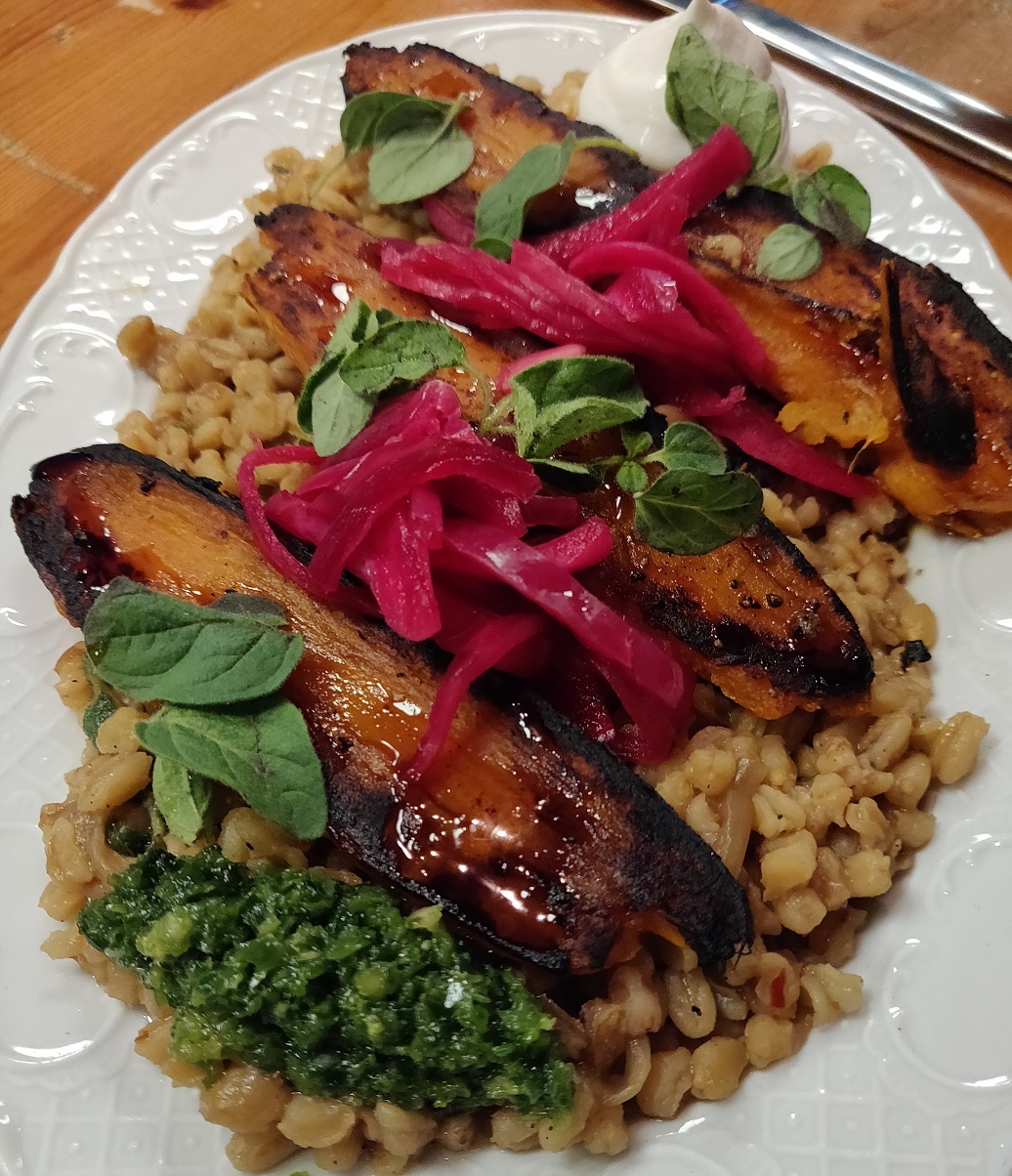 גם כאן צלחת שהקרינה שמחת חיים עם הרבה ירוק שהגיע מברוקולי צלוי, סלרי ומרווה. התלולית הלבנה זה קרם פרש יוגורט שנתן את הקונטרסט שלו. למטה - פתיתים שהתלווה להם טעם מעניין של תבלין שלא הצלחנו לזהות. על פי הברמן - ציר סרטנים, שגם בתפריט רשום במרכיבי המנה, אבל היה שם גם עוד משהו שלא זיהינו. האישה גם חושבת שאת הפתיתים הם עושים בעצמם, אבל אנחנו לא בטוחים. בכל אופן גם המנה הזו היתה שילוב מאד מוצלח של מרכיבים. עד כה שתי הפתעות לטובה.