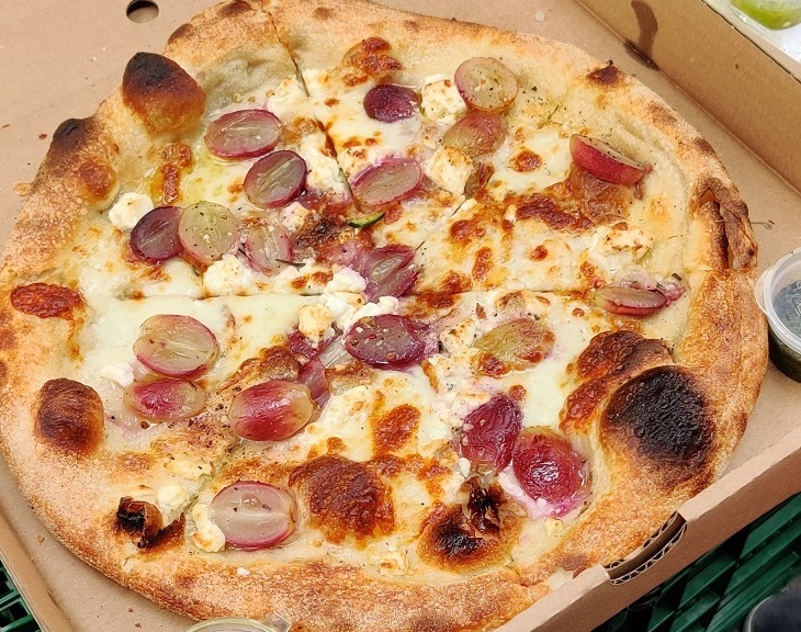 הפיצה השניה ממש בלטה מהספיישלים (יש גם גירסה דומה שלה בתפריט הרגיל). פיצה ביאנקה עם מוצרלה, רוזמרין, פטה עיזים וענבים.